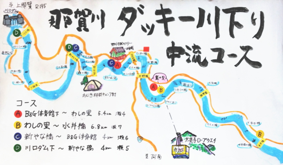 区間 各区間により難易度が異なります。 ●A:野外活動センター~鷲の里 5.4㎞ 瀬4 初級 ●B:鷲の里~水井橋 6.8㎞ 瀬7 初級+ ●C:新簗大橋~B&G体育館 4㎞ 瀬7 中級 ●D:ダム下~新簗大橋 4㎞ 瀬4 中級 ・ABロング12.2㎞ ・CDロング8㎞ 当日の天候と上流のダム放流量によって催行の可否を決定します。 |