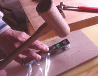 爪つきナットをハンマーで打ち込む前に、回り止め用に穴のまわりに接着剤をつける。セメダインはスーパーXG速乾性を使う。通常はつけなくても爪で止るのですが荷重のかかる箇所なので念入りに補強とした。 |