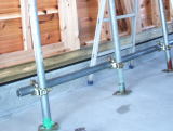 建設用足場の単管を長さを測って切断機で切り、クランプで骨組みを作る。ベースはコンクリート用ビスでの床に埋め込む。 |